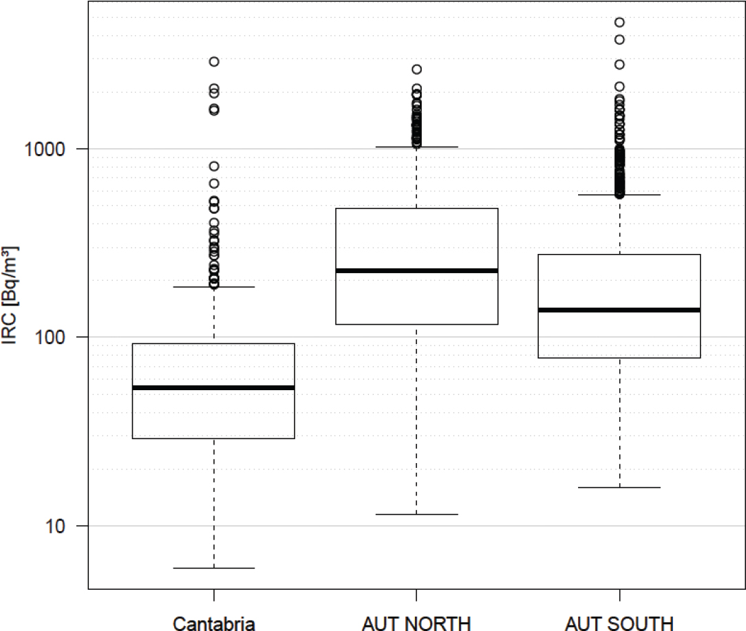 For Cantabria, the following explanatory variables based on the fivefold random cross validation were used for the final model: soil-type, ADR, K2O and Th content in soil. For the Austrian data sets, the following building characteristics were used: room earthbound (yes/no), floor, type of walls, type of basement (yes/no/partly), solitary building (yes/no) and type of bedrock. Additionally, the type of foundation and the U content were selected for the AUT North data set, while the fraction of measurement time in winter, the number of dwelling units, tightness of windows and water saturation of the soil were selected for the AUT South data set. The final models are fitted using these variables to predict log(IRC) according to specified grids (10 × 10 km for Cantabria and 2 × 2 km for Austria). Some results can be found in Table 3.