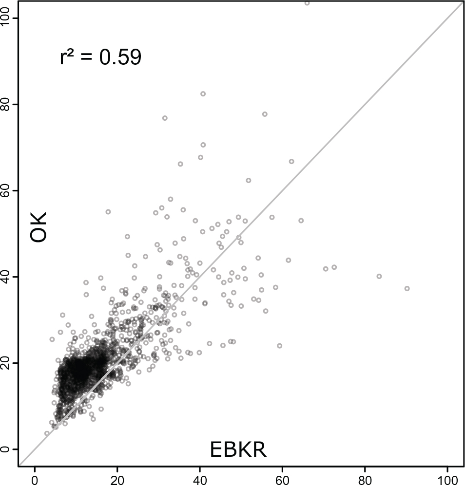 Fig. 3. Correlation between two different mapping methods for the GRP for Cantabria data set – OK vs. EBKR.