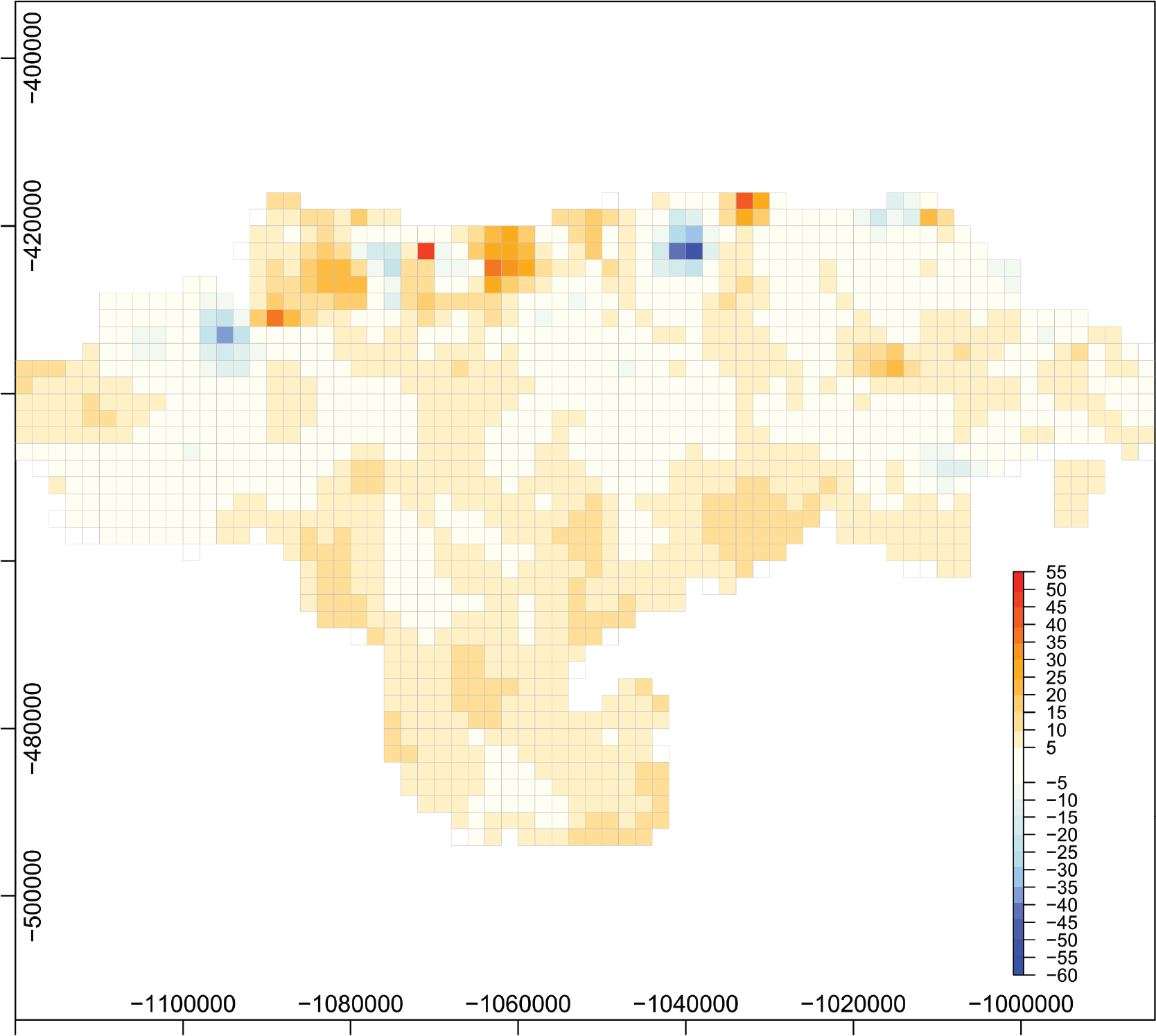Fig. 5. Absolute difference of the GRP prediction results in 5 × 5 km grid for Cantabria of OK (Fig. 4, left hand side) and EBKR (Fig. 4, right hand side).