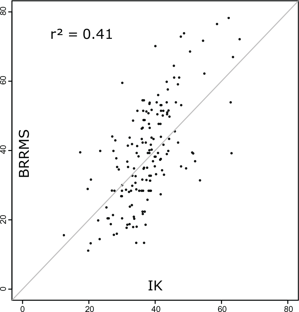 Figure 6 compares the BRRMS method with the IK method for the predicted percentage of measurements above 300 Bq/m³ for the area AUT North. As basis for comparison, the coarser 500 × 500 m grid of the BRRMS was used and compared with the cell of the 200 × 200 m kriging raster closest to the midpoint of the BRRMS grid cell. The coefficient of determination (R 2) is 0.41, which is still a satisfying correlation. In Figure 7, the results of the two methods are displayed as maps. The two maps are similar, showing the highest radon potential in the centre. In general, the predicted IRC by the BRRMS method is higher than the one by IK.