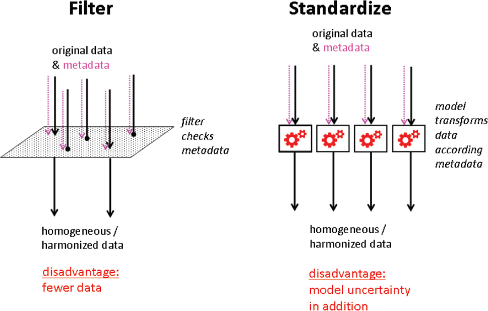 There are essentially two options of top-down data harmonization (Fig. 2): 1) data can be filtered according to the attached meta-information (e.g. only IRC values in ground floor rooms are considered, such as in the European Indoor Radon Map in (2)) and 2) data can be normalized to a common standard through modeling (e.g. IRC values from floors ≠ ground floor are transformed to a hypothetical ground floor value, based on a model of floor-dependence of the IRC (Friedmann’s RP, (10)). Both options require metadata whose variability sufficiently explains the local variability of the target variable (IRC in the example). The filtering leads to data loss and to an increase of coefficient of variation that scales as about 1/√n, where n is the number of measured dwellings (11). In contrast, standardization has the drawback of introducing model uncertainty; for example, normalizing floor level relies on a model derived from data, which implies estimation and prediction uncertainty, since buildings behave differently.