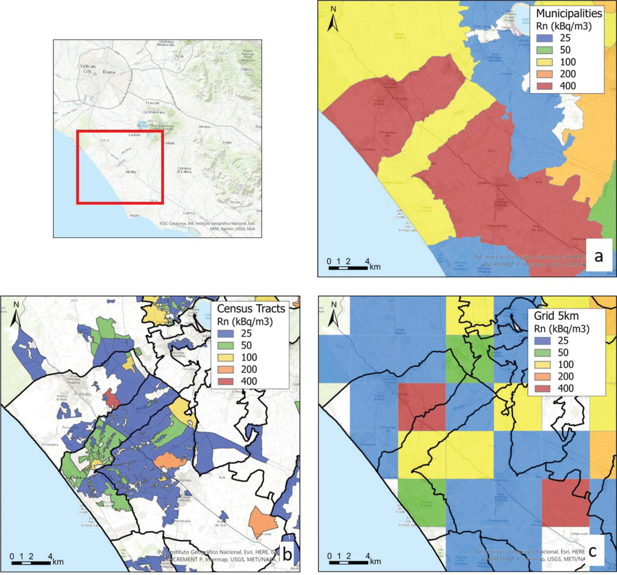 Figure 4 shows a real-world example of the aggregation of Rn concentration in soil-gas in Lazio (Italy) into three different mapping supports: municipalities, census tracts, and 5 km × 5 km grid cells. The maps look very differently although they are based on the same data and are all methodically correct. If two neighboring regions generate maps of the same quantity (e.g. IRC) based on different mapping supports, they are evidently incompatible, even though they are both correct. This effect may add accidentally sources of error and/or misinterpretation of the results or may be used to intentionally manipulate the results.