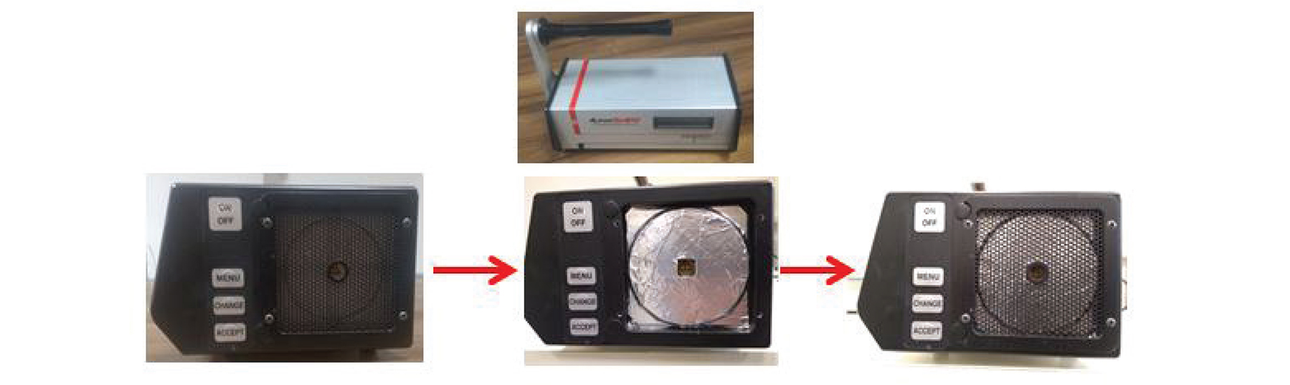 These results should be taken into account when aiming at reducing thoron interference of active radon monitors. To study the reaction of instruments to sudden change of the radon concentration, experiments were carried out by an active monitor that cannot discriminate between radon and thoron. The instrument was an old version of AlphaGUARD (Genitron GmbH, Germany) radon monitor, which cannot discriminate between radon and thoron. The AlphaGUARD monitors use alpha spectroscopy by pulse ionization chamber of active volume of 0.56 L. The active volume is protected by a glass fiber filter that is permeable for radon but stops dust and radon progeny from the exterior. The instruments employ a sophisticated algorithm for data processing based on alpha spectroscopy and pulse shape analysis (19). This algorithm discriminates the signal from radon progeny and sufficiently eliminates the inertia due to the radon progeny decay chain. The monitor operated in a diffusion mode with a 10-min measuring cycle. In this mode, radon/thoron diffuses into the detection volume through a filter that covers the entrance of the instrument, which serves as a built-in protective and diffusion barrier of the instrument. In experiments described elsewhere (3), it was found that in this mode, the thoron interference of the studied instrument is CI = (8.8 ± 1.3) %. To reduce this barrier, an additional diffusion barrier was made of a solid plate with a 1.3 cm2 square hole in the center (Fig. 2). With this additional diffusion barrier, the thoron interference was reduced about twofold to (4.23 ± 0.84) %.