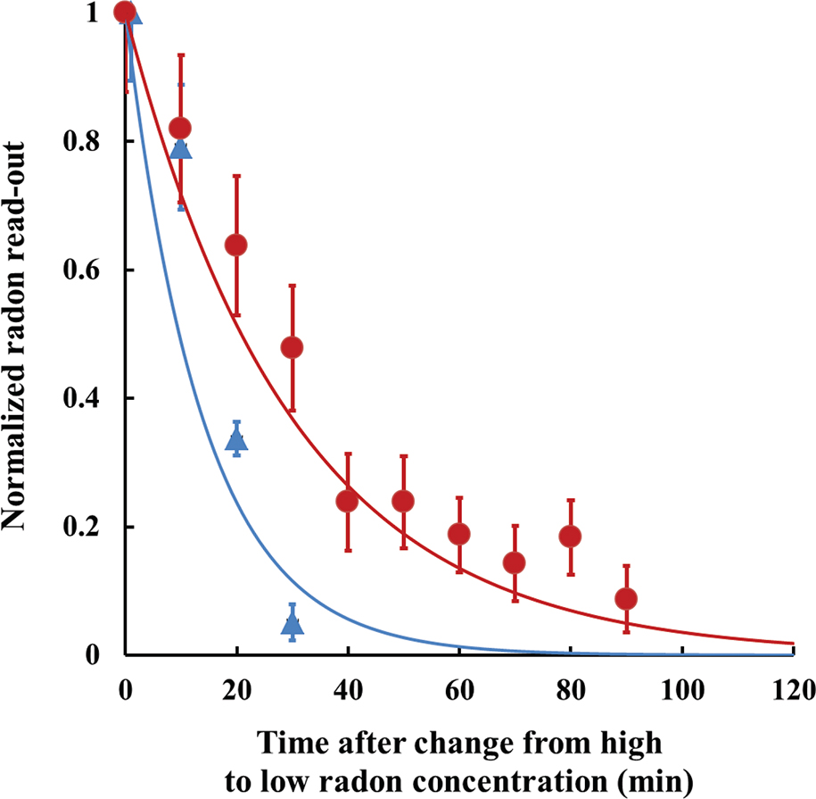 To study how this affects the reaction of the instrument to a sudden change in radon concentration, an experiment was performed in an isolated room with elevated levels of 222Rn (in closed room conditions, the 222Rn concentrations are usually within the range 1,200–2,200 Bq m-3). First, the instrument was started in the room and operated until the readout is stabilized at a level typical for this room. After that, the instrument was quickly (within 1 min) taken outside the building – outdoors where the radon concentrations were <10 Bq m-3. The change in the read-outs is shown in Fig. 3 (normalized to the first reading, that is, the concentration indoors). As clearly demonstrated, the decrease of readings is slower with the additional diffusion barrier placed, and the correspondence to the theoretical model (Fig. 1) is very good. This result also demonstrates that the inertia in the monitor response is mostly due to the inertia in the radon diffusion through the diffusion barrier.