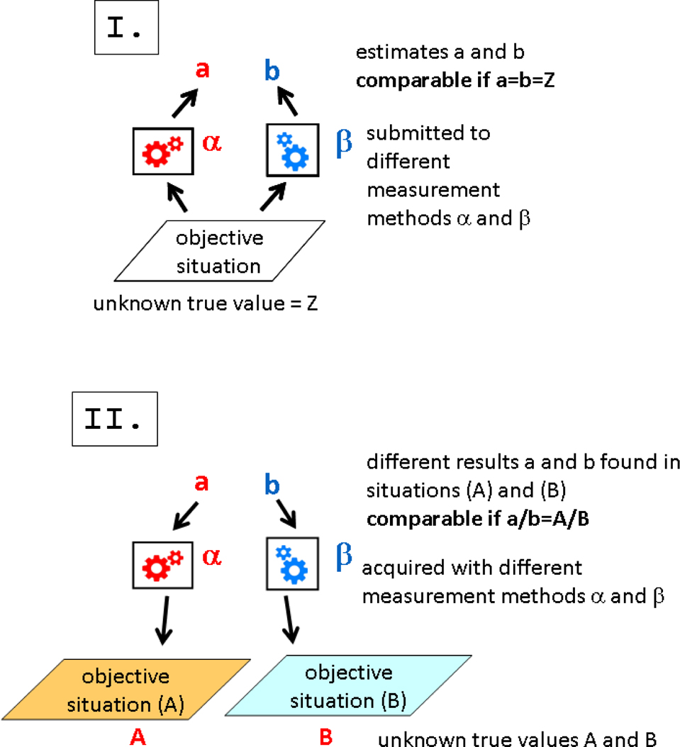 Fig. 1. The concept of comparability. Upper part (I): true quantity Z must lead to same measured values a = b; lower part (II): ideally, different measurement results must reflect the difference of the objective situation in which they have been acquired, but not the different acquisition methods.
