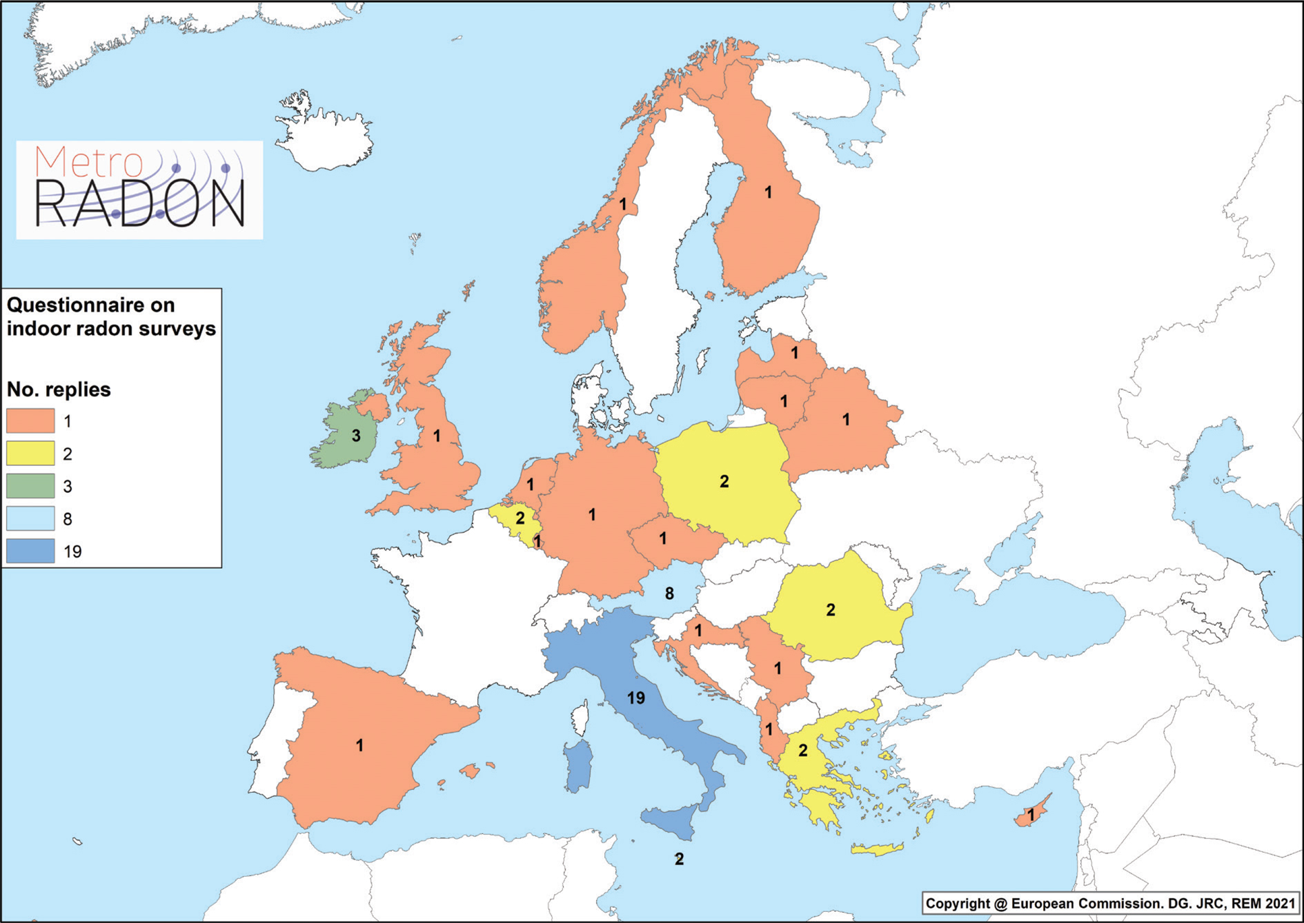 In the framework of the MetroRADON project, an indoor radon surveys questionnaire was designed and addressed to more than 70 European institutions working in this field, such as national authorities, regional administrations, universities, and research centers.