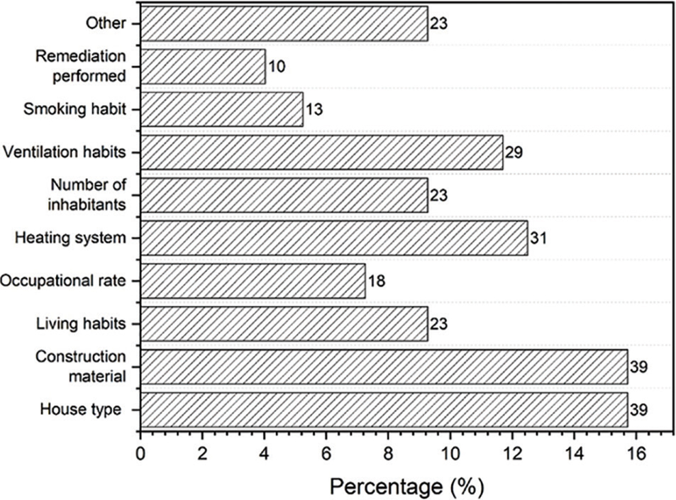 In almost 90% of the surveys, a questionnaire was used to collect metadata, that is, information about the measurement site (house type, building materials, heating system, remedial action performed, etc.) and anthropogenic factors (number of inhabitants, ventilation habits, smoking and living habits, etc.). Figure 4 shows the percentages of the selected metadata categories asked for in questionnaires that accompanied indoor radon surveys.