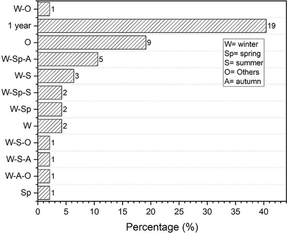 The analysis of the replies reveals that most of the surveys used passive devices (≈95%) for radon monitoring. Among the passive detectors, the most used are SSNTD based mostly not only on CR39 (more than 50%) but also on LR115 (around 25%). For the SSNTD detectors, 44% of respondents performed 1-year measurements. In the other cases, measurements were performed mostly during the winter (≈ 25%) but often covering more than one season. Figure 5 shows detailed information about the duration of the surveys.