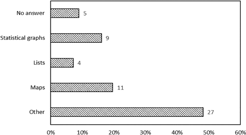To the question about the mode in which the data were presented to the public or the authority, the majority replied ‘other’ (Fig. 6). This is because between the options proposed in the questionnaire, several important ones were missing; according to the respondents, these are as follows: