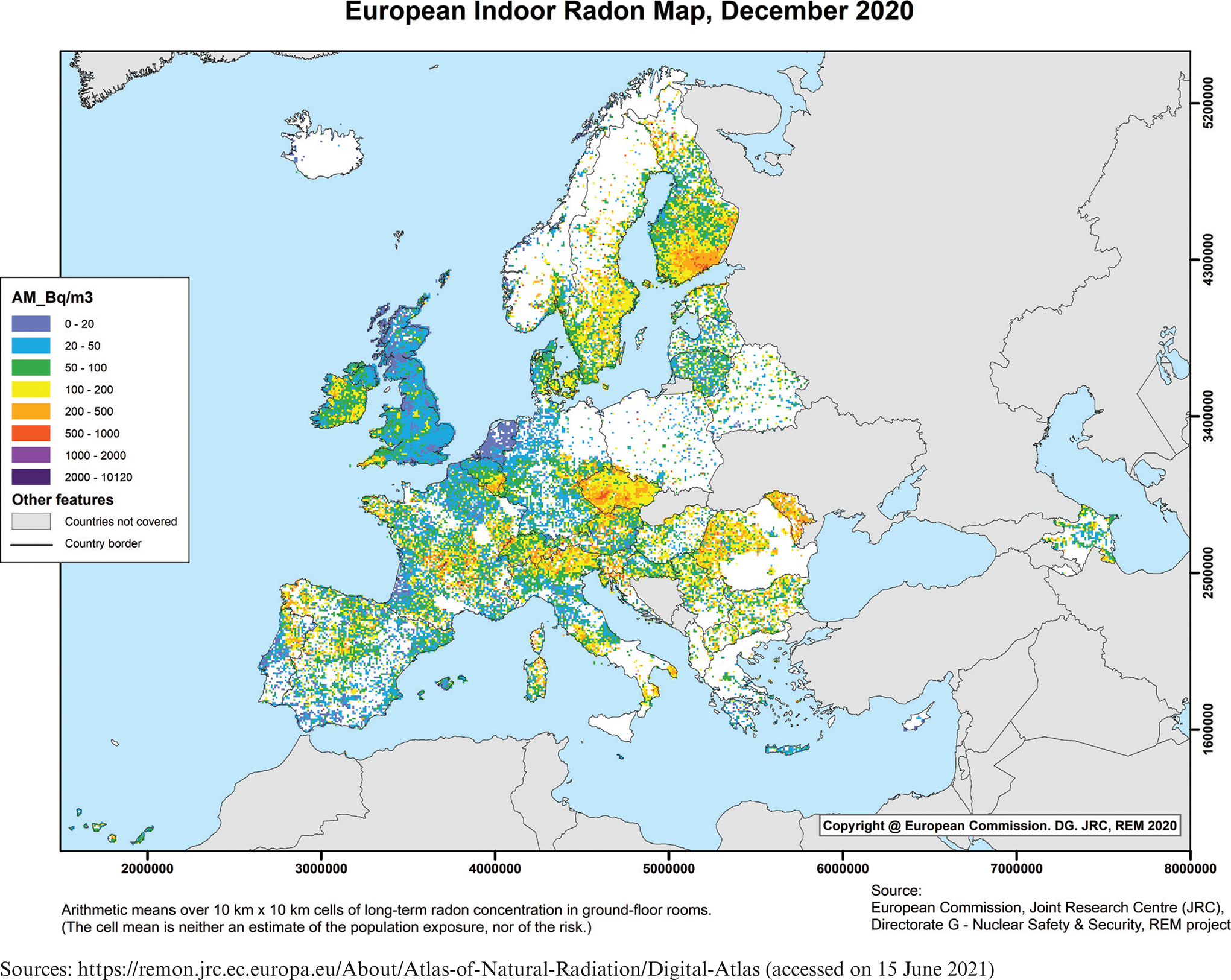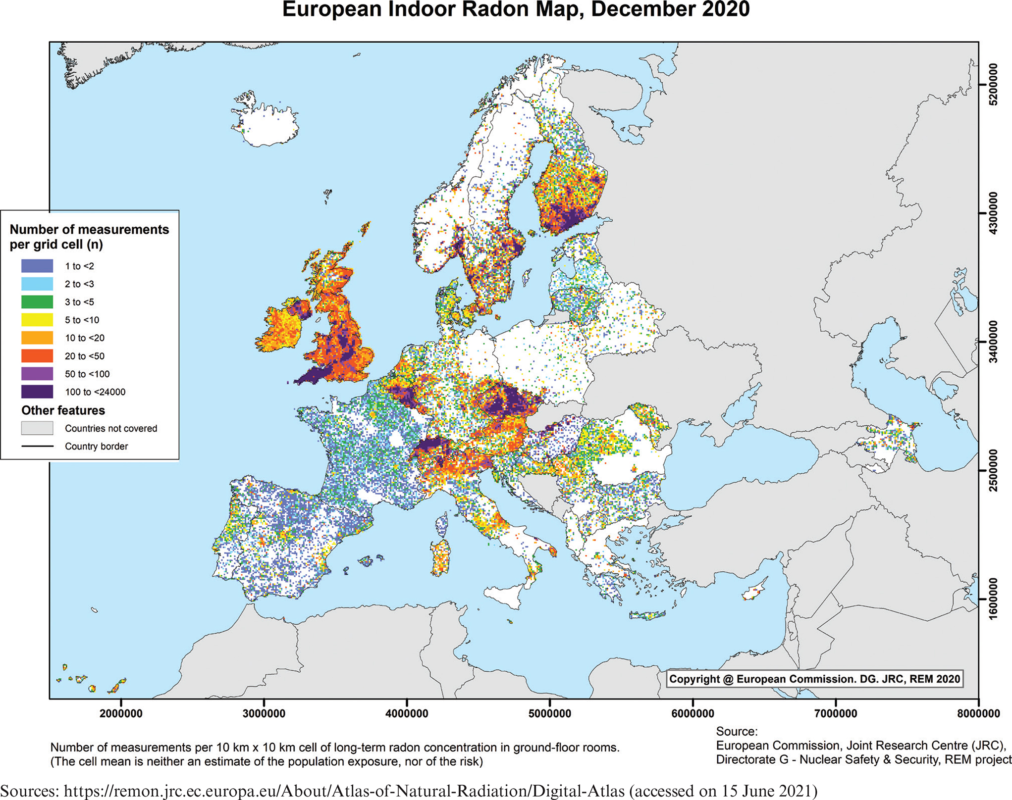 The comparison between indoor radon concentrations (Bq/m3) and lung cancer rates (incidence and mortality) could, indeed, highlight possible areas of high risk in Europe. In order to perform such a mapping exercise, historical cancer incidence data at registry level (as the official sources of cancer incidence) and cancer mortality data at national or local level (on the whole Europe) will be linked with radon concentrations from the European Indoor Radon Map (EIRM), which is included in the European Atlas of Natural Radiation (7) also hosted by the JRC. The EIRM map reports the number of measurements and arithmetic means of long-term (ideally, annual or representative of annual average) indoor radon concentrations in ground-floor rooms of dwellings, over 10 km × 10 km grid cells covering Europe (Figs. 5 and 6). The reported means are in effect an overestimation of the real exposure owing to the fact that, in urban areas, the majority of people do not live on the ground floor or in the basement, where the highest radon concentrations are generally measured (16).