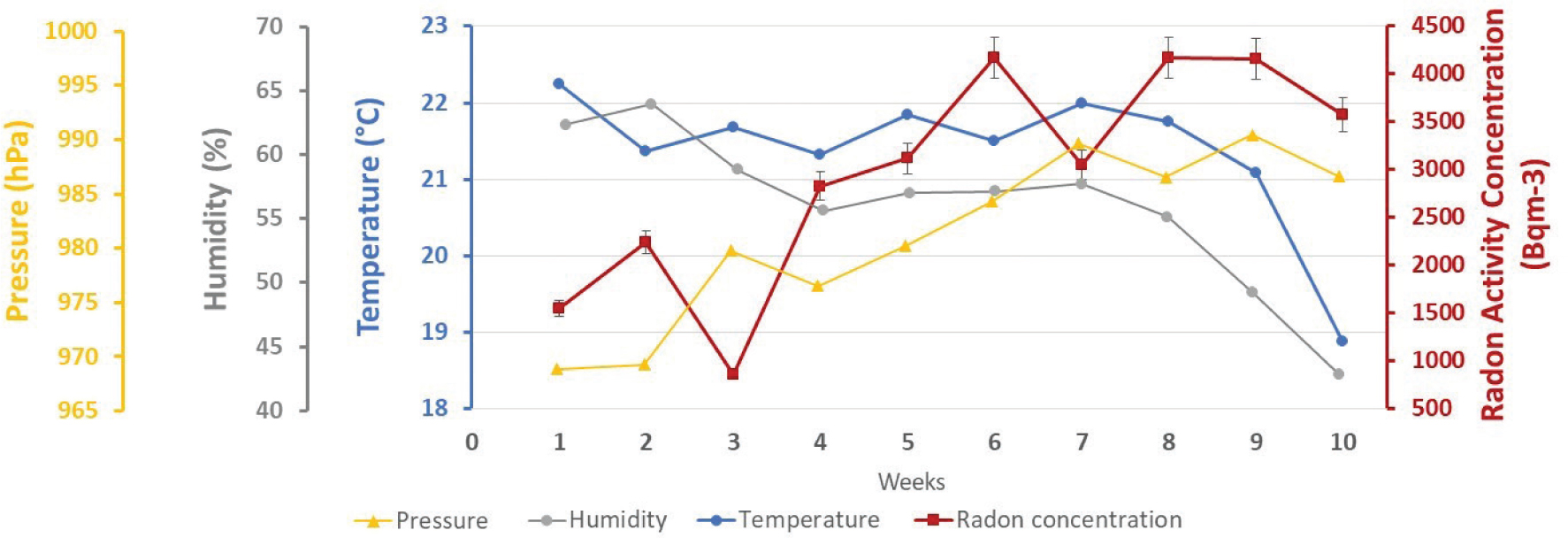 Fig. 1. Radon activity concentration (Bq/m3), temperature (°C), humidity (%), and pressure (hPa) for the measurement period in the bedroom of the new-born in the Iragna dwelling.