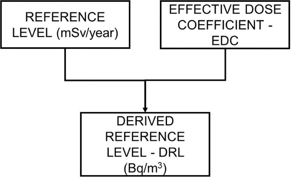 Once the reference levels (e.g. the effective dose values to be respected) have been chosen, the DRLs for indoor radon, expressed as radon activity concentration, are calculated using the EDC. This calculation is illustrated by Fig. 2.