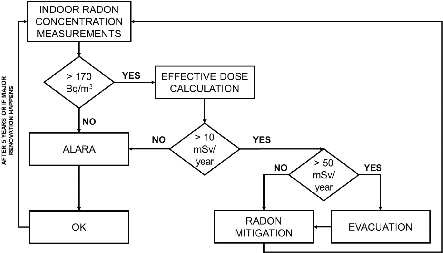 | Source: Adapted from (22). aLong stay > 30 h/week bShort stay between 15 and 30 h/week cUninhabited place <15 h/week dIf before finishing the radon mitigation, a major renovation of the building is performed, radon mitigation should occur concurrently. eWorkplaces with more than 1,000 Bq/m3 are considered ‘radon risk workplaces’ and workers are considered occupational exposed if the dose received is above 10 mSv/year. And they are subject to the disposition of article 167 ORaP. |