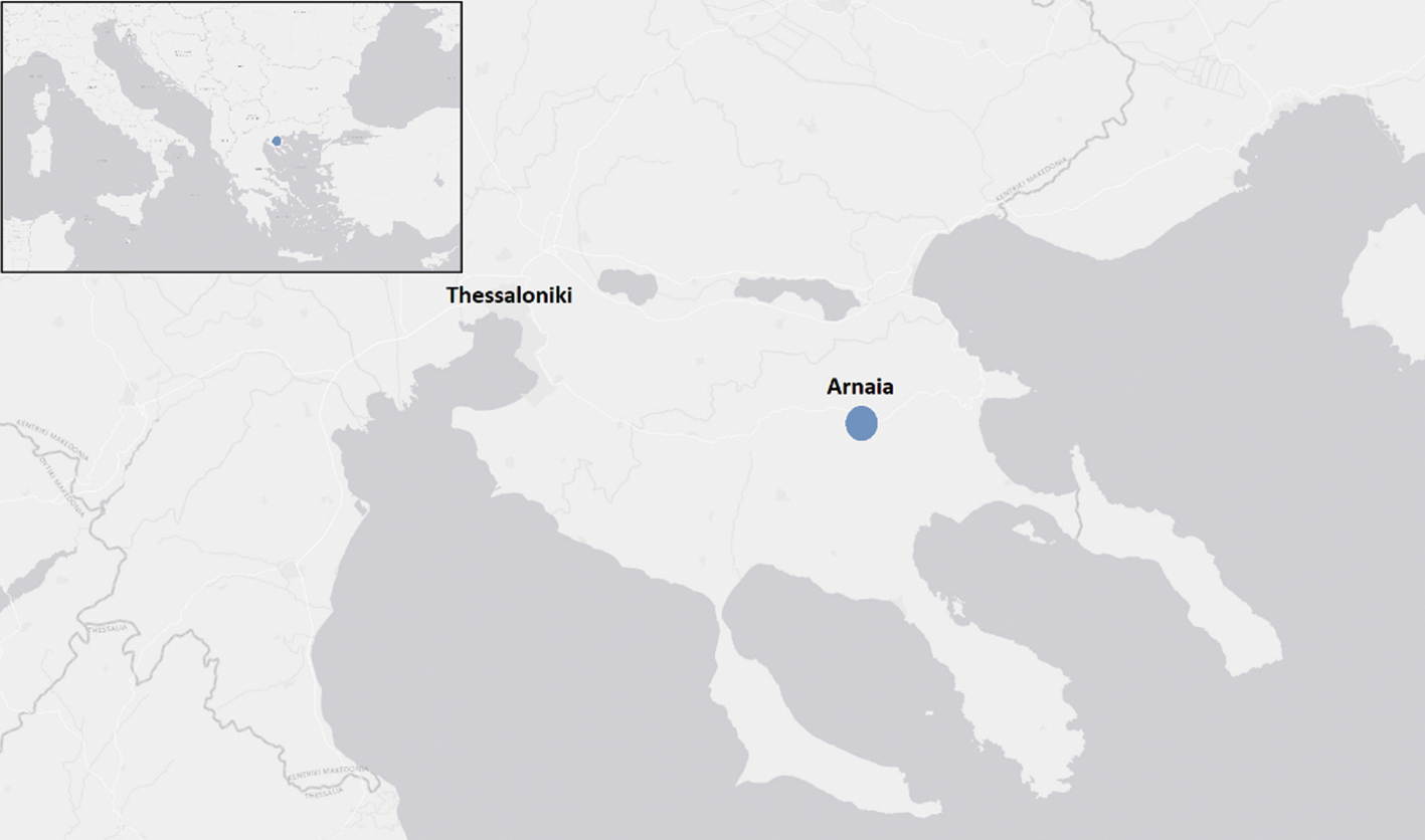 To conduct the study, all water samples were collected from the village of Arnea (40°29’10.7”N, 23°35’11.2”E) in Greece, whose location is shown in Fig. 1. Arnea is geologically known for its underlying granitic rocks (12). Granites usually have higher than average uranium content, and when water originates from granite formations, it could have elevated uranium and radon concentrations (13, 14). In Arnea, there is a borehole with increased radon concentrations (838 ± 86 Bq L–1). The samples were collected from a tap located just above the borehole.