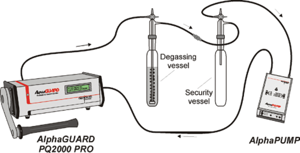 To determine radon activity concentration using Alpha Guard and its Aquakit, a water sample of 100 mL was carefully transferred into a gas-tight glass degassing vessel. After closing the loop, the Alpha pump is turned on, causing degassing of radon, which circulates through the air of the closed-loop, as shown in Fig. 2. As a result, radon passes through the ionization chamber of Alpha Guard, where it is measured. For the calculation of radon in water activity concentration, the following formula provided by the manufacturer was used (15):