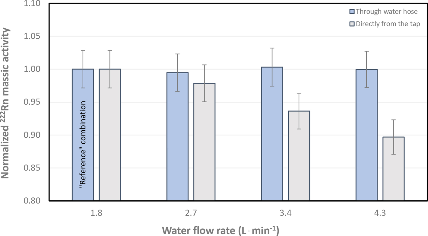 From the results shown in Fig. 4, it can be observed that when the sample is collected using the first method (hose immersed to the bottom of the bottle), no radon losses exist regardless of the water flow rate (<4.3 L min–1). In contrast, with the second method (directly from the tap), a decline of 222Rn concentration is observed, resulting in losses of 10 ± 3% at a water flow rate of 4.3 L ּ min–1 compared to the ‘reference’ combination.
