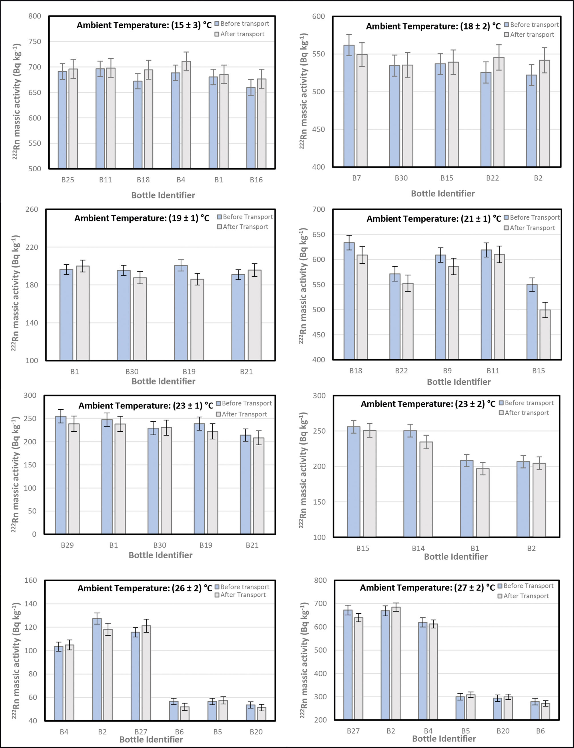 Design and Methods: In terms of sampling, two methods were examined and compared. Road transport effect on radon losses was studied by measuring the radon in water concentration of radon-rich samples before and after their transportation at different ambient temperatures. Different materials (PET, glass, aluminum) were examined for their radon tightness by repetitive measurements and interpolation of the recorded data. Also, the effect of ambient temperature (1 to 40°C) on radon losses was studied during the storage phase. To compare radon in water measuring methods, water from the original bottle was poured carefully into the different sample containers that each method requires and measured by each method.