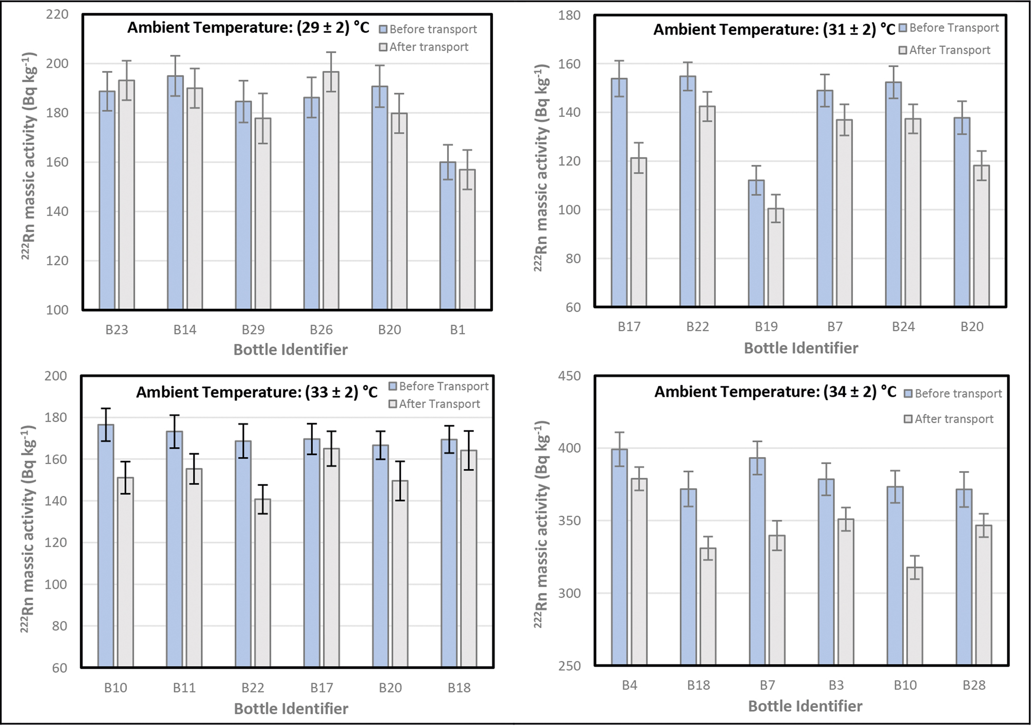 When transport is required, the water temperature should be kept stable as it can influence the level of degassing and eventually radon loss during transport. As mentioned in the ISO standards (6), the container must be kept at low temperatures after sampling, preferably lower than the temperature at the time of sampling (but above 0°C to avoid freezing), to help preserve radon in the sample. The influence of regular air transport on radon loss was reported in a previous study, and no significant loss was found (5).