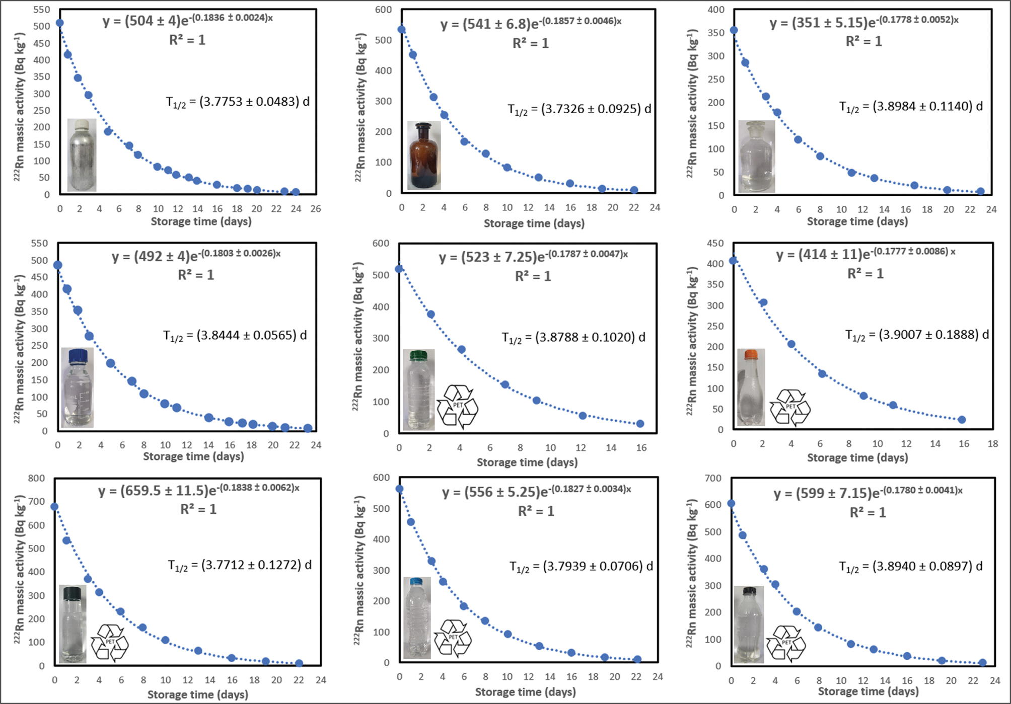 Considering the results shown in Table 5, the fitting curves of all containers follow the literature radon decay curve within their uncertainties. So, it can be said that in all containers, regardless of their construction material and cap type, no significant radon losses occur during their storage at the temperature of 19 ± 1°C.