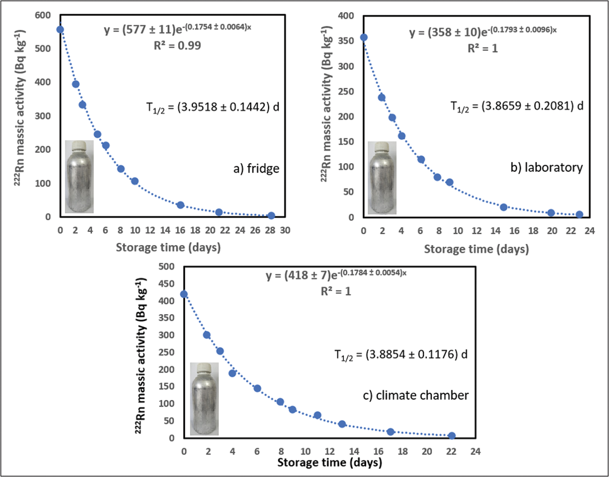 To investigate the effect of temperature on radon losses during storage, ‘Reference’ aluminum containers were stored in a fridge (1 ± 0.4°C), in the laboratory (21 ± 2°C) and in a climate chamber (40 ± 0.4°C) for more than 22 days. The containers were measured at different times for their 222Rn activity concentration during that period. The radon decay curves of all containers, as a function of time, were obtained from the recorded data. Using the MATLAB’s curve fitting tool, the decay constants (λ) were obtained, from which the half-lives were then calculated. In total, 12 containers were examined, four for each temperature. The graphs in Figure 9 show the radon decay curves as a function of time for one of the containers placed at each temperature.