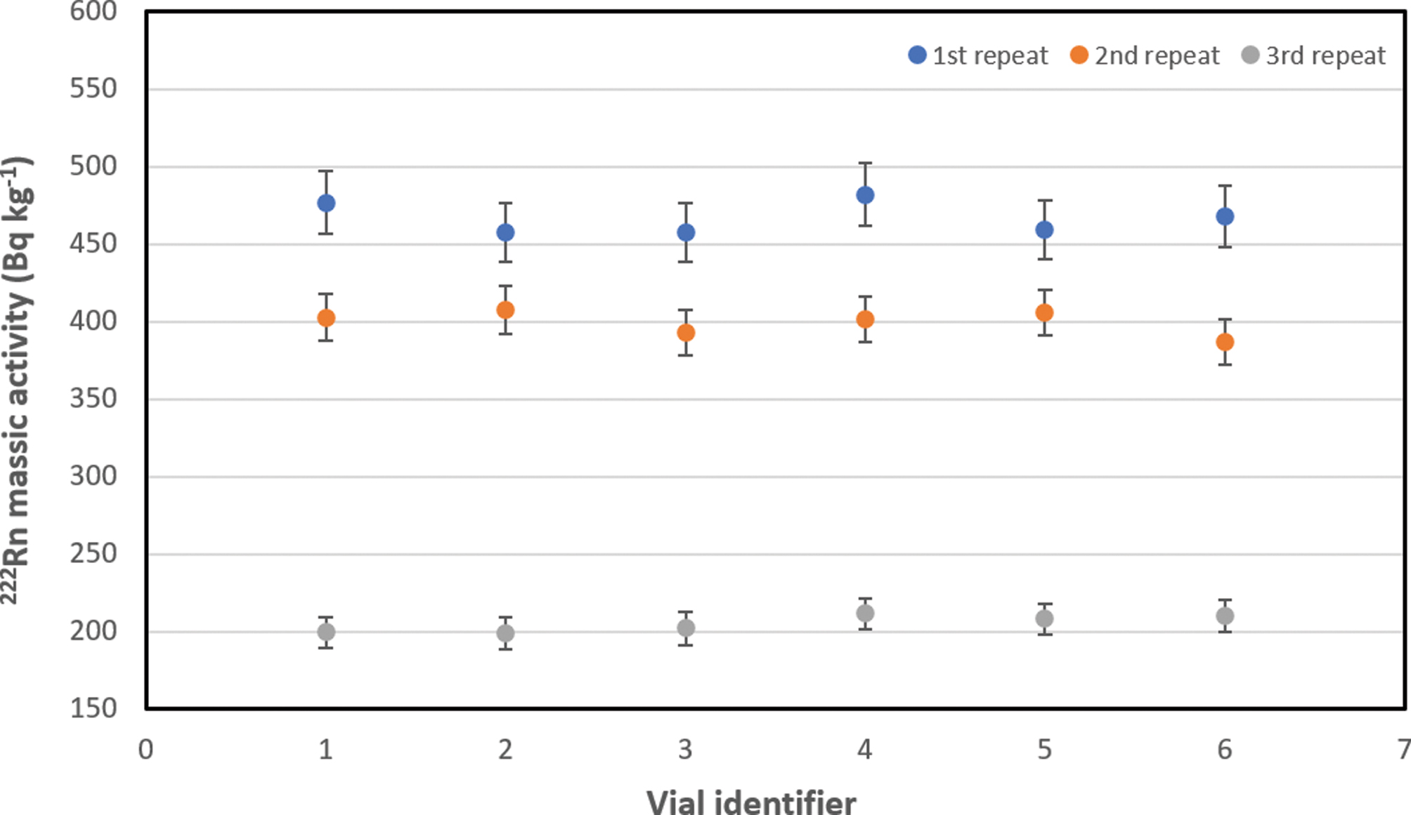 At first, to ensure that the same amount of radon is poured into the different sample containers that each method requires, water from a 600 mL container (original bottle) was poured carefully into six 100 mL volume vials. Then, each vial was measured for its radon activity concentration. The same experiment was repeated three times. Figure 10 shows the results.