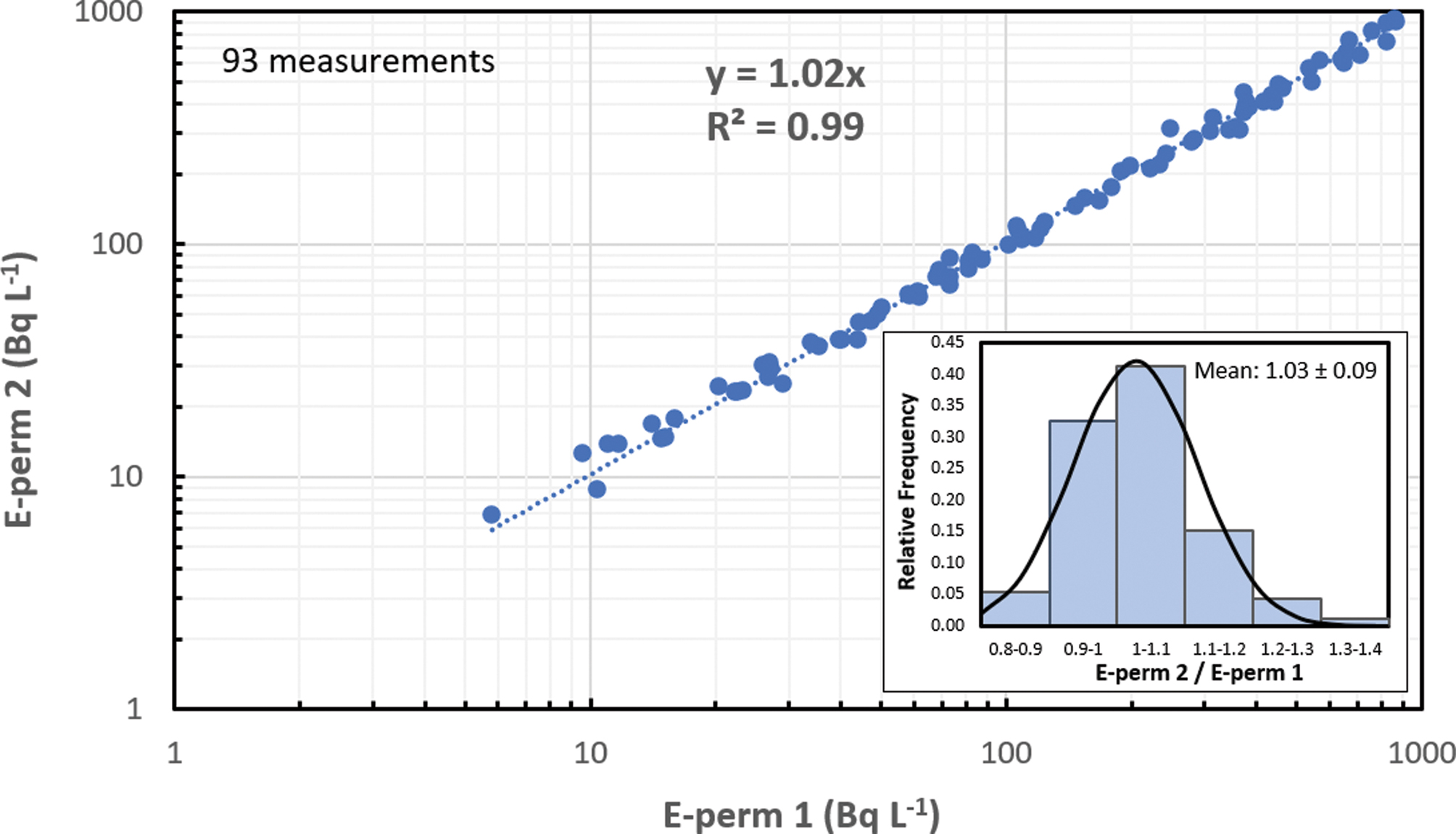 Fig. 16. Correlation between 222Rn activity concentration measured with E-perm 2 and E-perm 1. Histogram of the relative frequency of the ratio of E-perm 2 to E-perm 1 measurement results with its normal distribution fit.