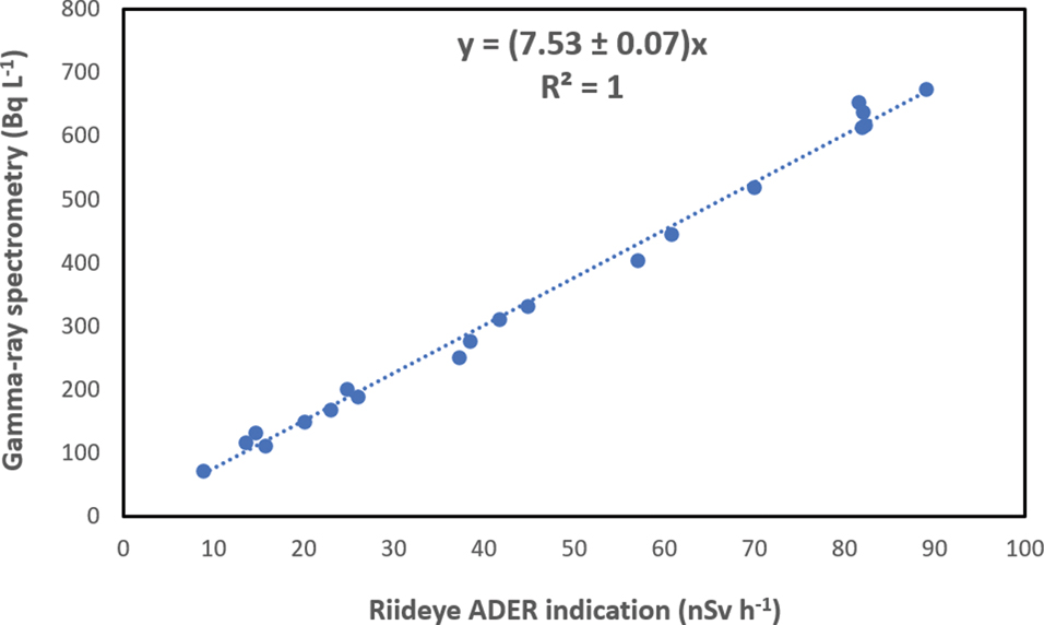 A method was developed to determine radon in water activity concentration by measuring the ambient dose equivalent rate (ADER). A 3” × 3” NaI (Tl) detector (RIIDEye M-G3) was placed in front of a 4L radon-rich water container, and the ADER value provided by the detector was obtained. After that, the background ADER value was measured and subtracted from the ADER value measured with the radon-rich water, so the net ADER value was obtained. The container was then opened and measured for its 222Rn activity concentration by gamma-ray spectrometry. The exact process was repeated 20 times with radon-rich water containers with activity concentrations from 71 to 674 Bq L–1. Figure 17 shows the correlation between the ADER value and the 222Rn activity concentration measured by gamma-ray spectrometry. A slope of (7.53 ± 0.07) was found.