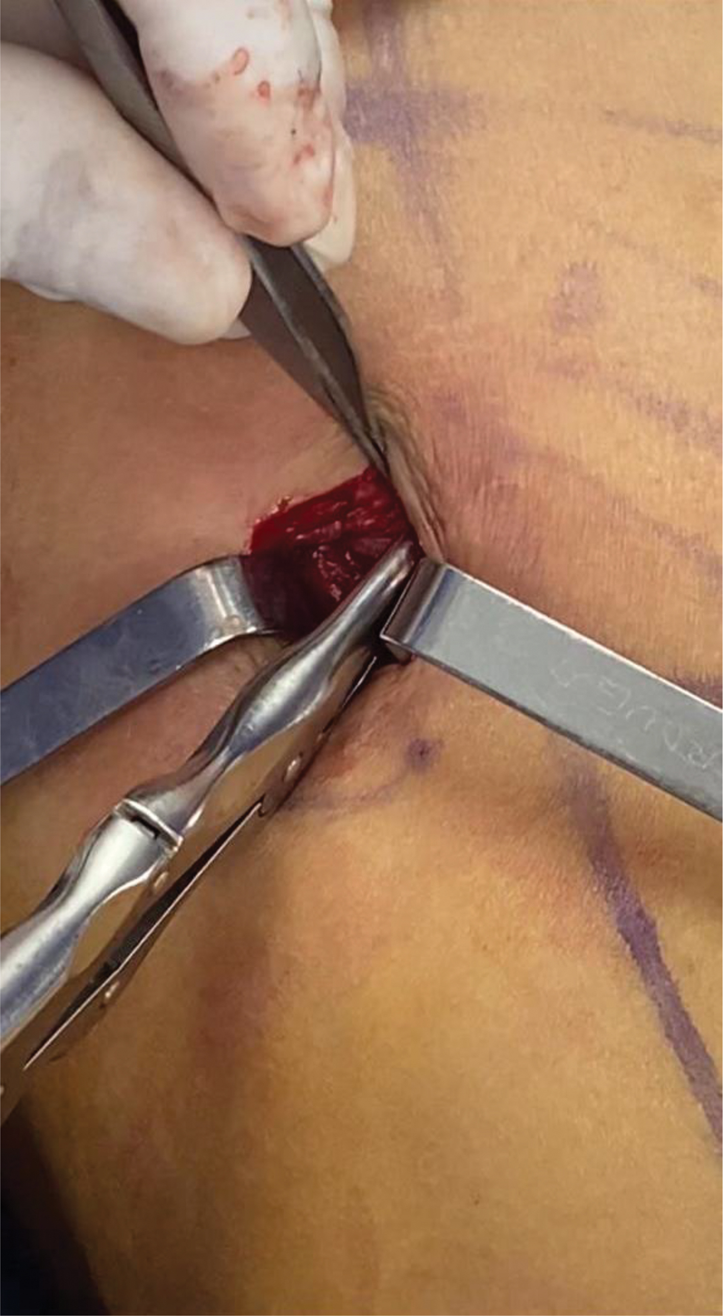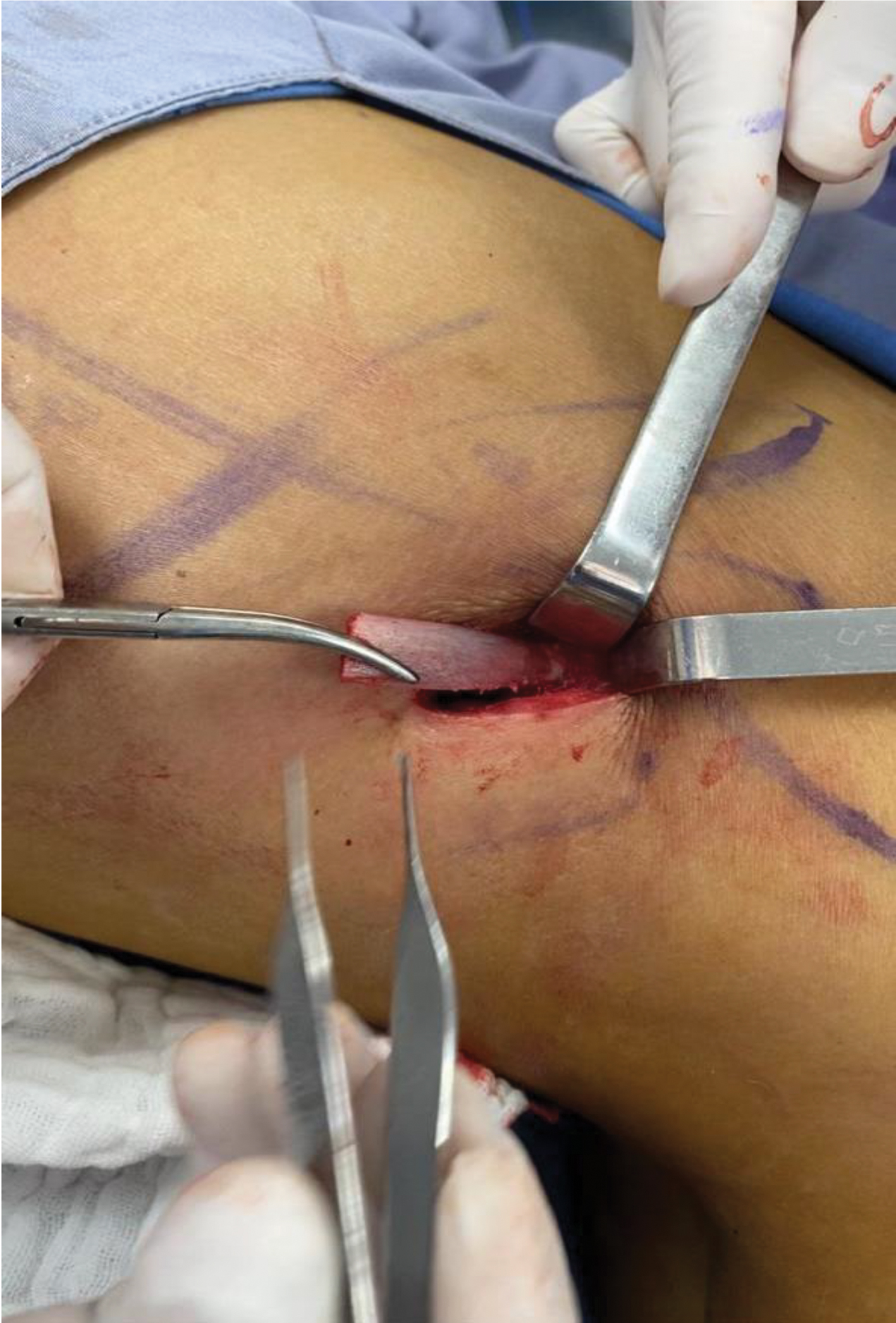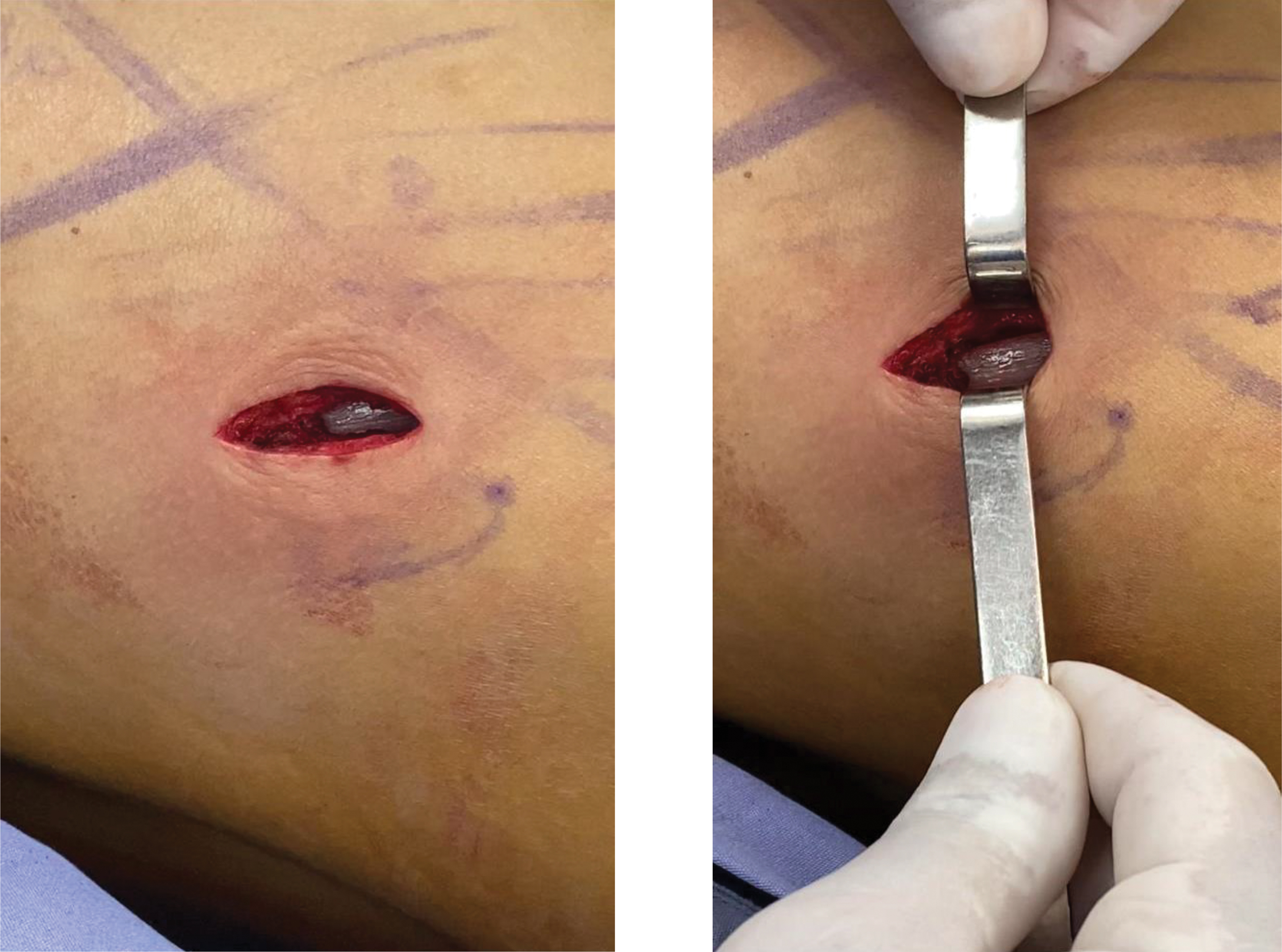 Fig. 1. 2.5 cm incision. The orifice above is from the liposuction’s approach port.