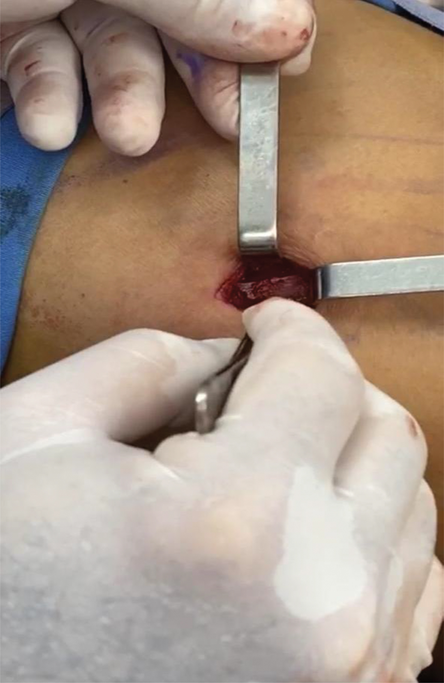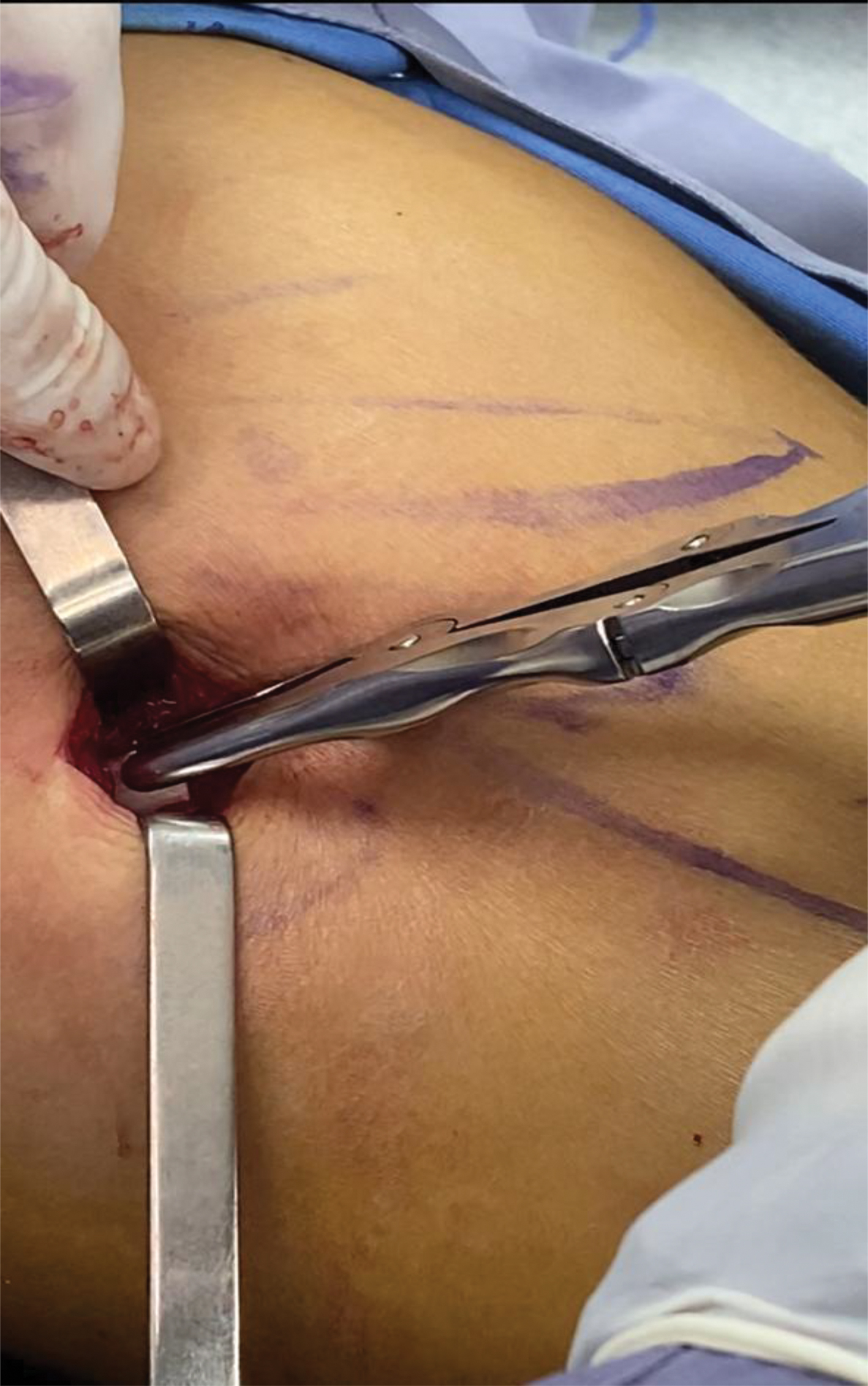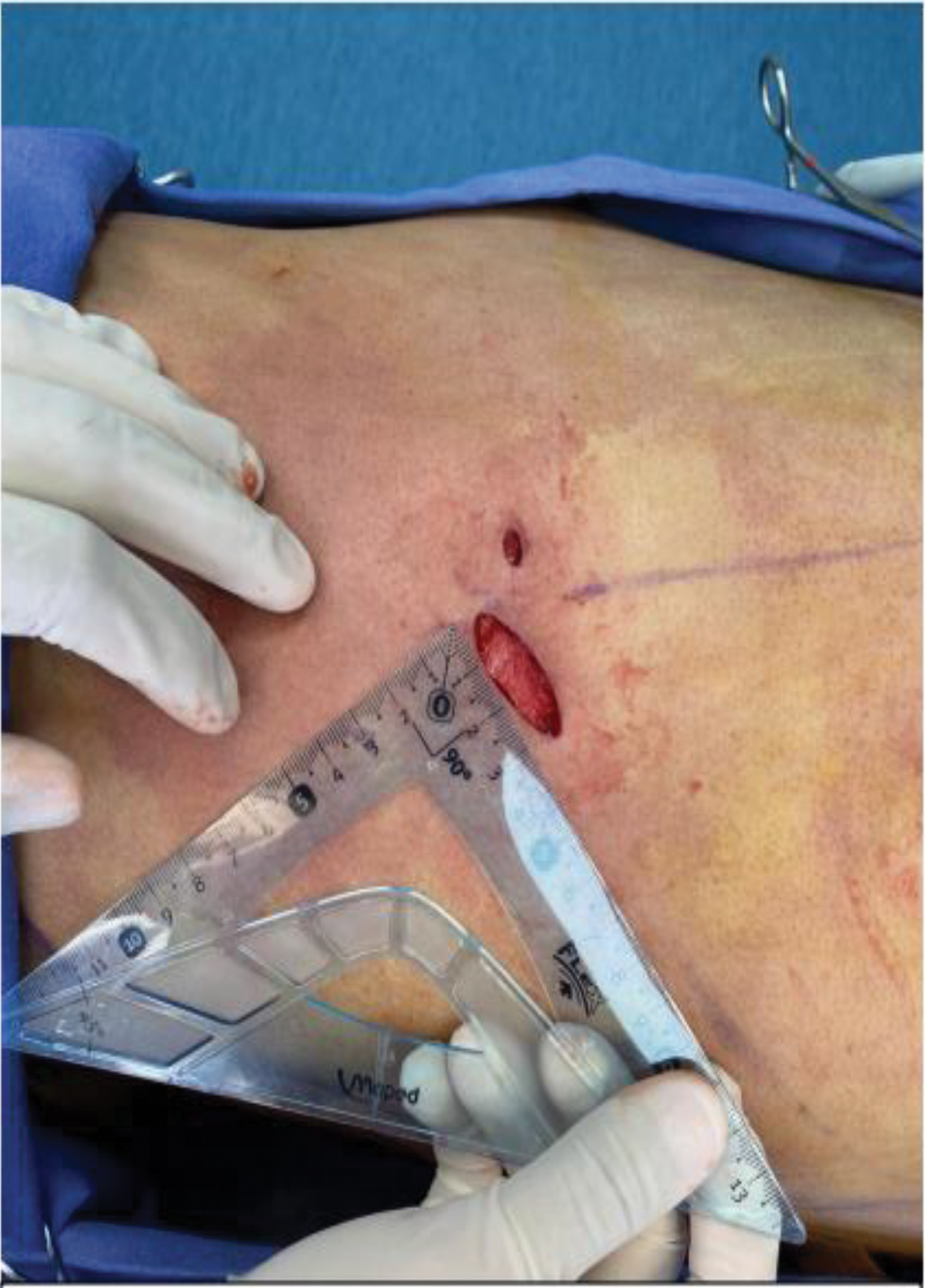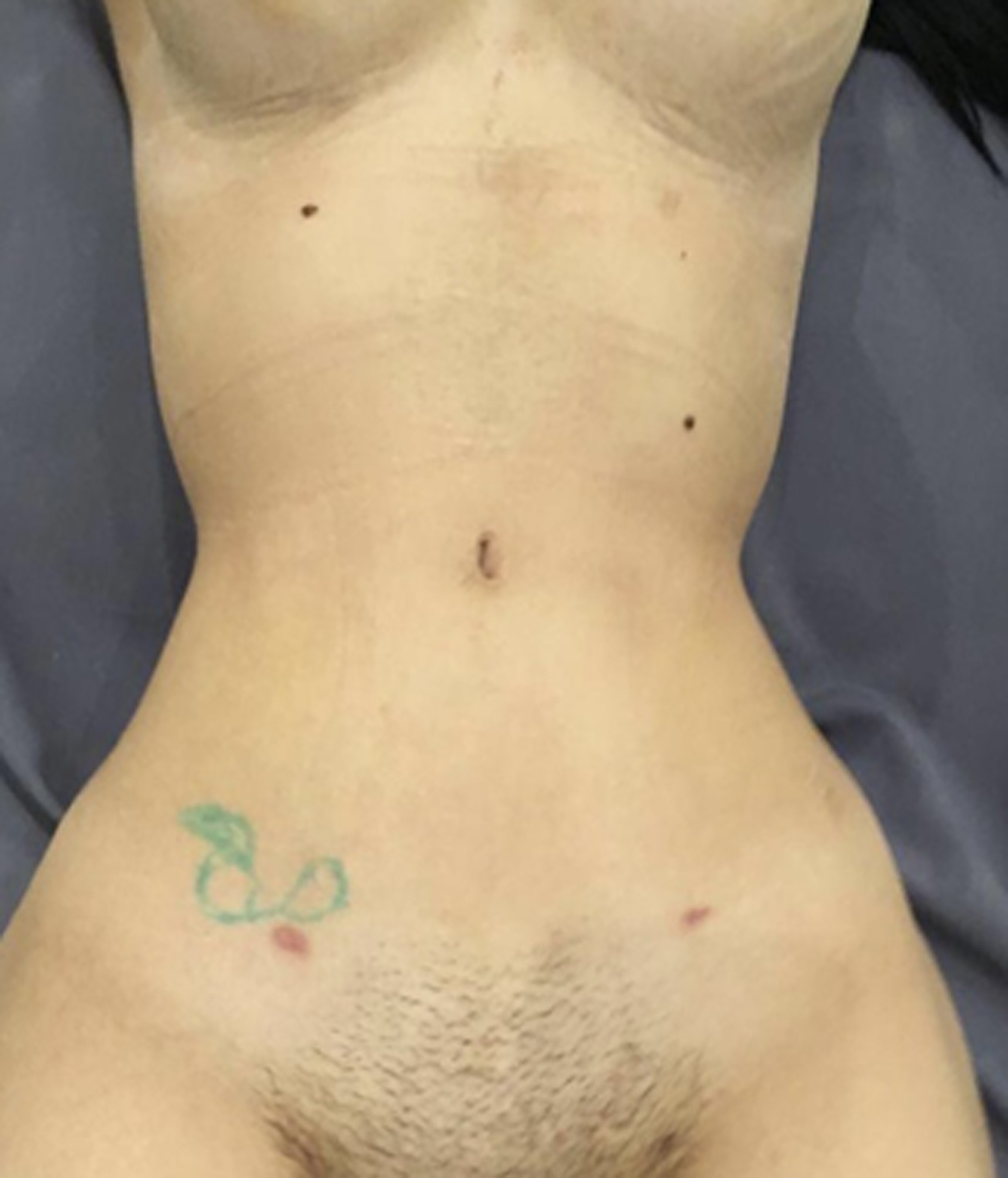 Fig. 1. 2.5 cm incision. The orifice above is from the liposuction’s approach port.