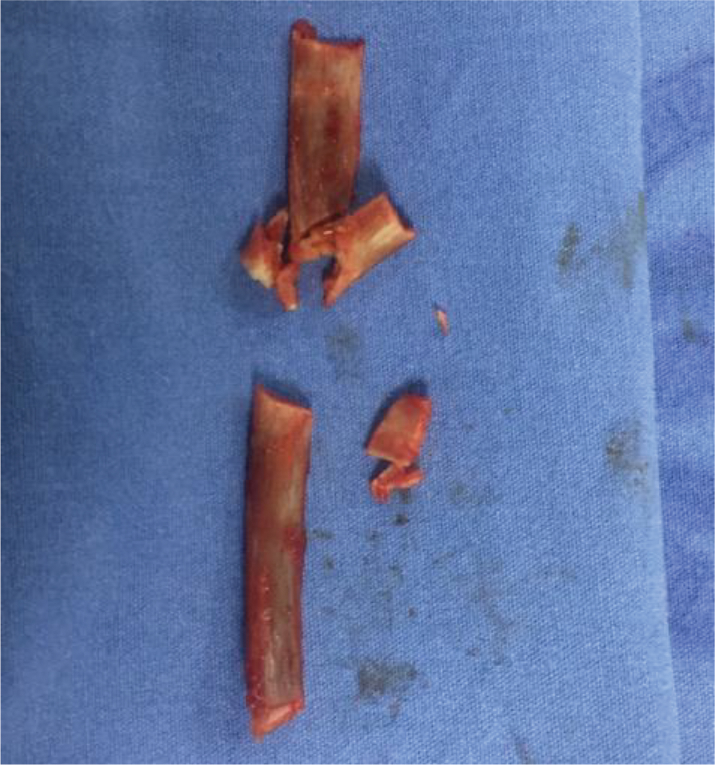 Subsequently, the posterior aspect of the rib is carefully dissected, leaving the rib bed intact and the rib perfectly separated on its posterior aspect allowing a segmental resection of 1–1.5 cm of the segment of the 10th rib. Later, it is verified that both ends, both proximal and distal, or of the 10th rib is blunt and atraumatic.